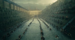 This is one of the opening shots in the movie Les Miserables. It features hundreds of men working on a in the water. They are prisoners and put to work by strict guards. This scene sets a tone for the rest of the movie, and plays into the titles, which means “the miserable ones.” This screenshot does not give the viewers a look into a character, rather it sets the scene.