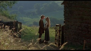 The Princess Bride tells the story of a farm girl who goes on a quest to find her love. This scene in the movie shows the emotional moment before he leaves her. The screenshot gives an idea of where and when this movie is taking place based on the farm scenery and what the characters are wearing. You can tell this is taking place a long time ago in a fairytale land and the love the couple has for each other.