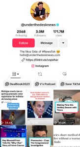 Under the Desk News is a popular TikTok account. The host, V Spehar, worked a cooperate job before posting short videos explaining top political news stories. Although she is not a professional journalist, Spehar has grown a massive following based on her ability to break down facts.