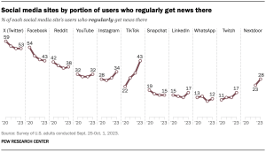 Pew Research Center. (2023, November 15). Social Media and News Fact sheet. Pew Research Center’s Journalism Project. https://www.pewresearch.org/journalism/fact-sheet/social-media-and-news-fact-sheet/#:~:text=News%20consumption%20on%20social%20media&text=Slightly%20fewer%20(26%25)%20regularly,%25