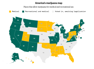 This map, made by NBC News, shows the states the standing of legal marijuana across the U.S. Instead of listing the states, the visual helps people understand in a shorter time frame. Plus, it saves them the hassle of reading and looking for information on their state.