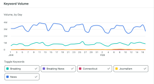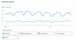 SproutSocial has a feature called “Twitter Keyword Report” that allows you to look at certain hashtags and see how often they are used with the history of the hashtag’s popularity. I looked into five hashtags relating to the journalism industry to learn how using certain hashtags could help improve my content reach. All the data is based off the usage of the hashtags since January 1, 2024.