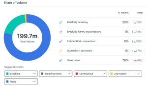 The share of volume, or amount of people talking about a hashtag and responding to it, also shows that #News and #Breaking are far more popular. When all the hashtags are compared, they make the other hashtags look like they are not being used at all.