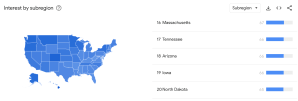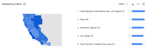 In California, cities near the border of Arizona are booming with coffee shop interest. Santa Barbara and San Diego are both close to the Arizona base of the coffee shop and have extremely high interest based on this map. Other Google Trend statistics show coffee shop searches in California are at their highest peak yet, which shows similar data to the interest in Arizona.
