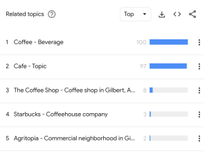 But when looking at topics related to coffee shops, there is a different story. There is some competition, but there is low interest in searches. It seems there is not a mega popular coffee shop brand in the state right now, which could boost business at a new option.